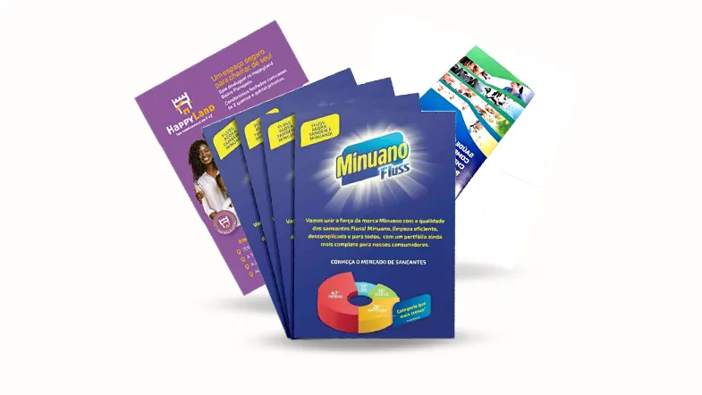 Produzimos folders, flyers, mala-direta, catálogos, calendários, sacolas, tags, displays, agendas, cadernos personalizados, capas de CD, pastas, envelopes, blocos, cartões, adesivos, caixas e muito mais.